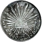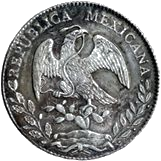 Escudo Nacional Mexicano con el águila de frente; en el perímetro la leyenda "REPÚBLICA MEXICANA" y una gráfila dentada. | Estas monedas del sistema octaval sobrevivieron el Imperio de Maximiliano y el cambio al sistema decimal, esto se debió a la confianza que manifestó el mundo y en especial el medio oriente por estos ejemplares. El diseño de esta pieza se conservó, con algunas interrupciones, durante más de setenta años, se conocen ejemplares de 1824 hasta 1897. | ![]() |