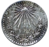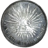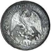 Gorro frigio radiante con la palabra "LIBERTAD" inscrita; en el perímetro el valor expresado por las palabras "UN PESO", la ceca, la fecha de acuñación, las iniciales "AM" de los ensayadores, la ley de la moneda y una gráfila conocen ejemplares de 1898 hasta 1909, cabe aclarar que en la reforma monetaria de 1905 se ordenó cambiar la leyenda del anverso por la de "ESTADOS UNIDOS MEXICANOS", pero las piezas que se acuñaron hasta 1909 conservaron la leyenda "REPÚBLICA MEXICANA". |